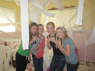| Meg, Berkley and Emma decorated her room. McKell was surprised to come home from school and find them hiding and her room full of sweet posters and tons of toilet paper. |